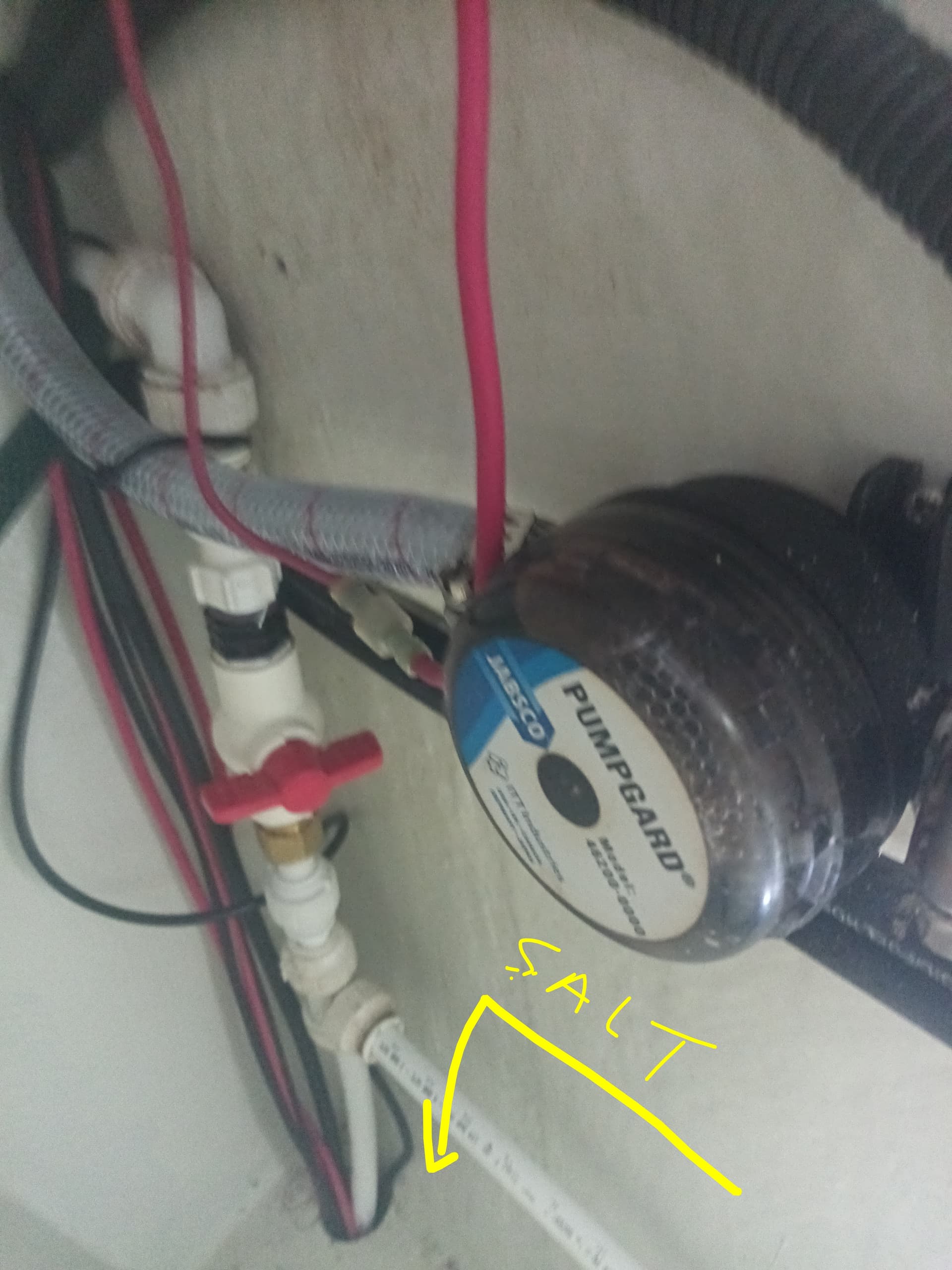 For the feed side, I have a temporary line from the port side , from the water maker pickup. This runs from the port bilge , behind the couch forward to the starboard pump locker.